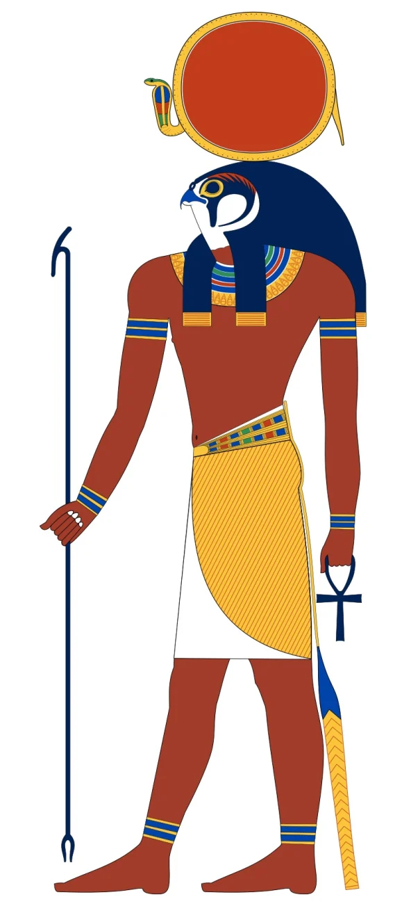 Ra was the sun god who created and sustained the world through his daily journey across the sky and through the underworld. He appeared as a falcon headed man with a sun disk or as a scarab at dawn and an aged creator at dusk. His barque traveled the night waters where he defeated the serpent Apophis to ensure sunrise.