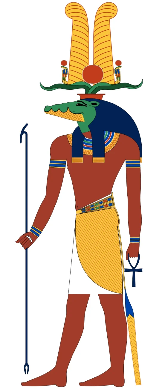 Sobek embodied the strength and unpredictability of crocodiles and therefore guarded waters and marshes. He was invoked for protection in areas where crocodiles were common and for military vigor during campaigns. His iconography showed a crocodile or a man with a crocodile head wearing a headdress of feathers and sun disk.