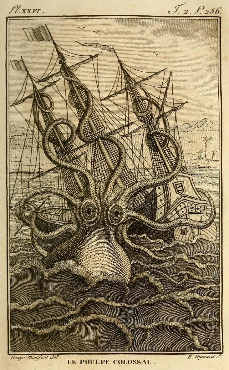The Kraken legend matches observations of very large cephalopods along cold ocean currents. Modern research has documented giant and colossal squid that occupy deep water zones and occasionally float to the surface after upwelling events.