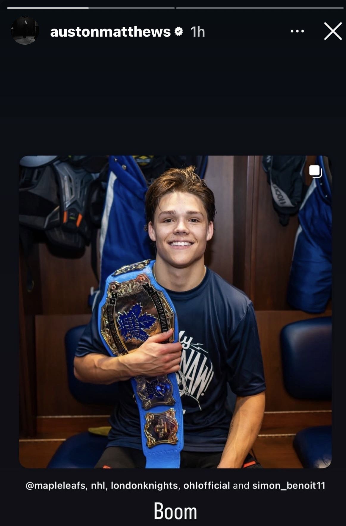 Following the game, HC Craig Berube congratulated Easton Cowan, with Steven Lorentz handing him the player of the game belt in the dressing room. In his acceptance speech, Cowan said: