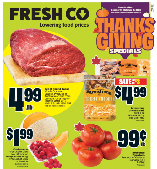 Freshco Ontario has several Thanksgiving Special this week, including a great price for Eye of Round Roast. Until October the 15th the roast is just $4.99 a pound. Here are some of the other deals available this week at Freshco: