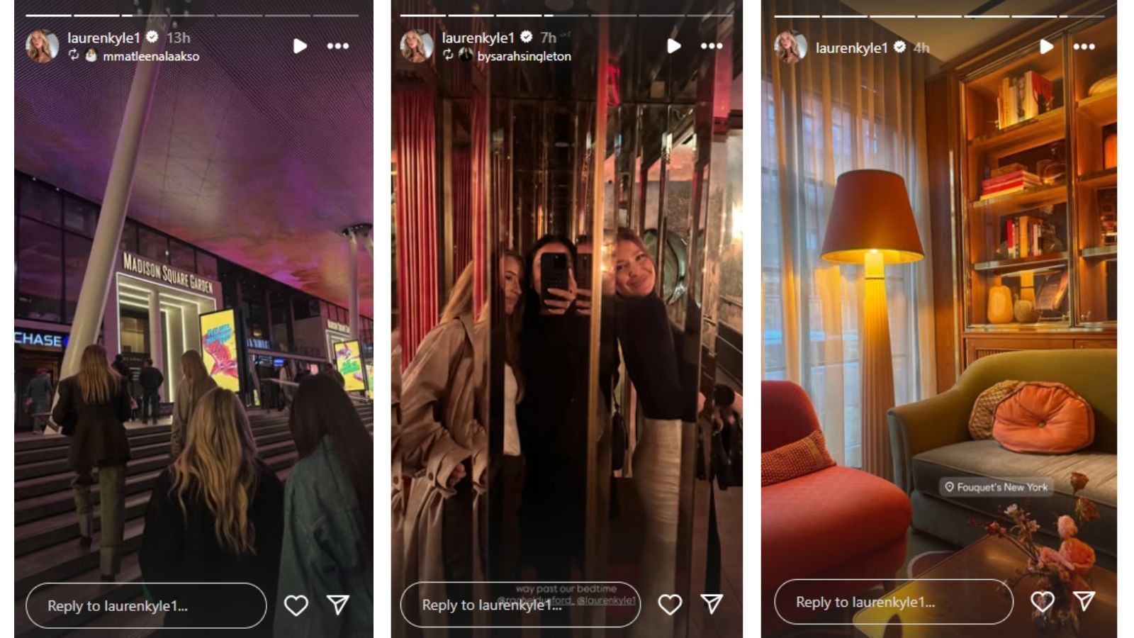 “Way past our bedtime @racheldunford @laurenkyle1,” read the caption of the story.The evening wrapped up back at their chic stay at Fouquet’s New York, which Lauren showed in another story featuring the warm tones and plush decor.