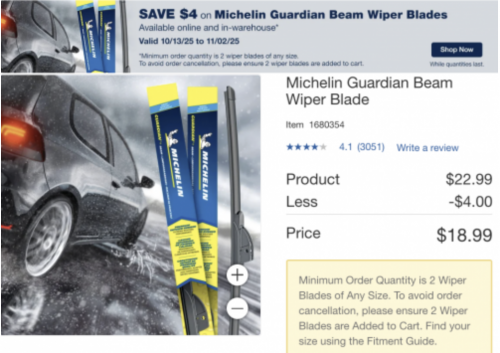 Save $4 off the Michelin Guardian Beam Wiper Blade, now for $18.99. This offer is valid until October 26, 2025.