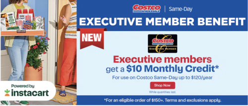 Costco Canada has a great Executive Member Benefit available now. Executive Members get a $10 Monthly Credit, for an eligible order of $150+, for use on Cistco Same-Day up to $120/year.