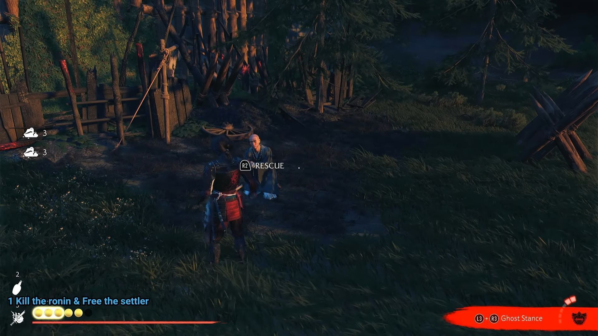 Now, walk up to the group of ronin and start a Standoff to quickly defeat them all to rescue the healer. Finally, break down the wooden barricade blocking the camp's entrance to get inside.