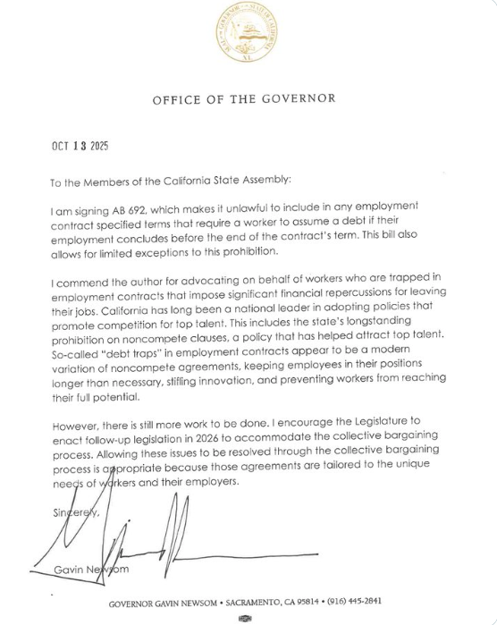 Governor Gavin Newsom signed AB 692 on October 13, 2025, marking a landmark step for nurse mobility and workplace rights in California. The law prohibits employers from requiring nurses and other workers to pay back debts or penalties simply for leaving their jobs before a specified date—a common practice known as “Training Repayment Agreement Provisions (TRAPs)”. These contracts have forced new RNs, especially recent graduates and immigrant nurses, to pay thousands of dollars for orientation or basic on-the-job training if they leave before the end of their two- or three-year employment term.