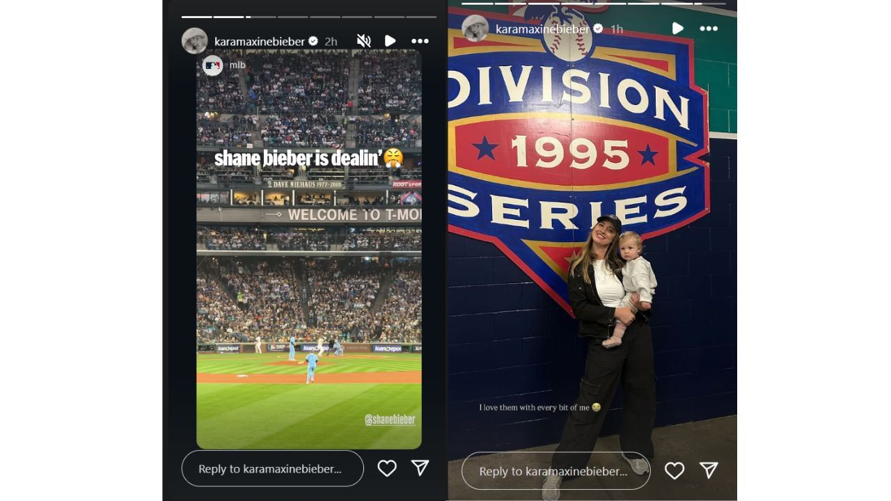 Kara, who was inside the T-Mobile Par,k posted a four-word reaction to a clip in which Bieber is pitching. She wrote: