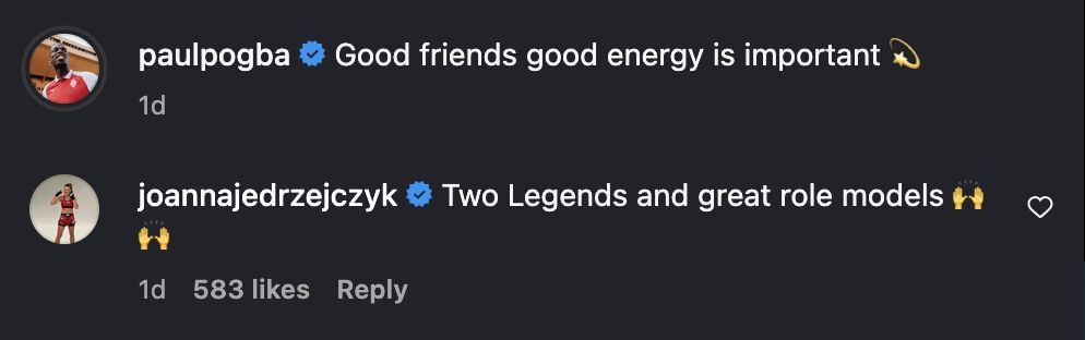 UFC legend Joanna Jedrzejczyk was quick to comment on the Instagram snap and added that the two are “legends and great role models.”